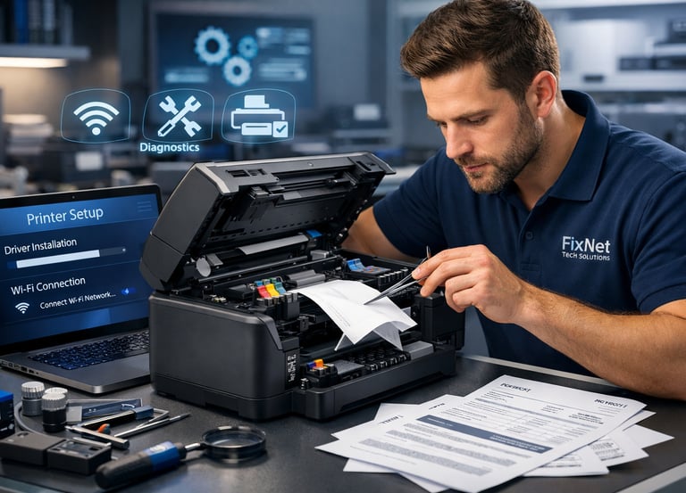 Printers get jammed, stop connecting to WiFi, or print faded pages. We fix paper jams, install drivers, clean inside the machine, and set up wireless printing so everything works perfectly. Regular printer maintenance is important because a broken printer can stop your homework, business invoices, or important documents. We keep it working so you never miss a deadline.